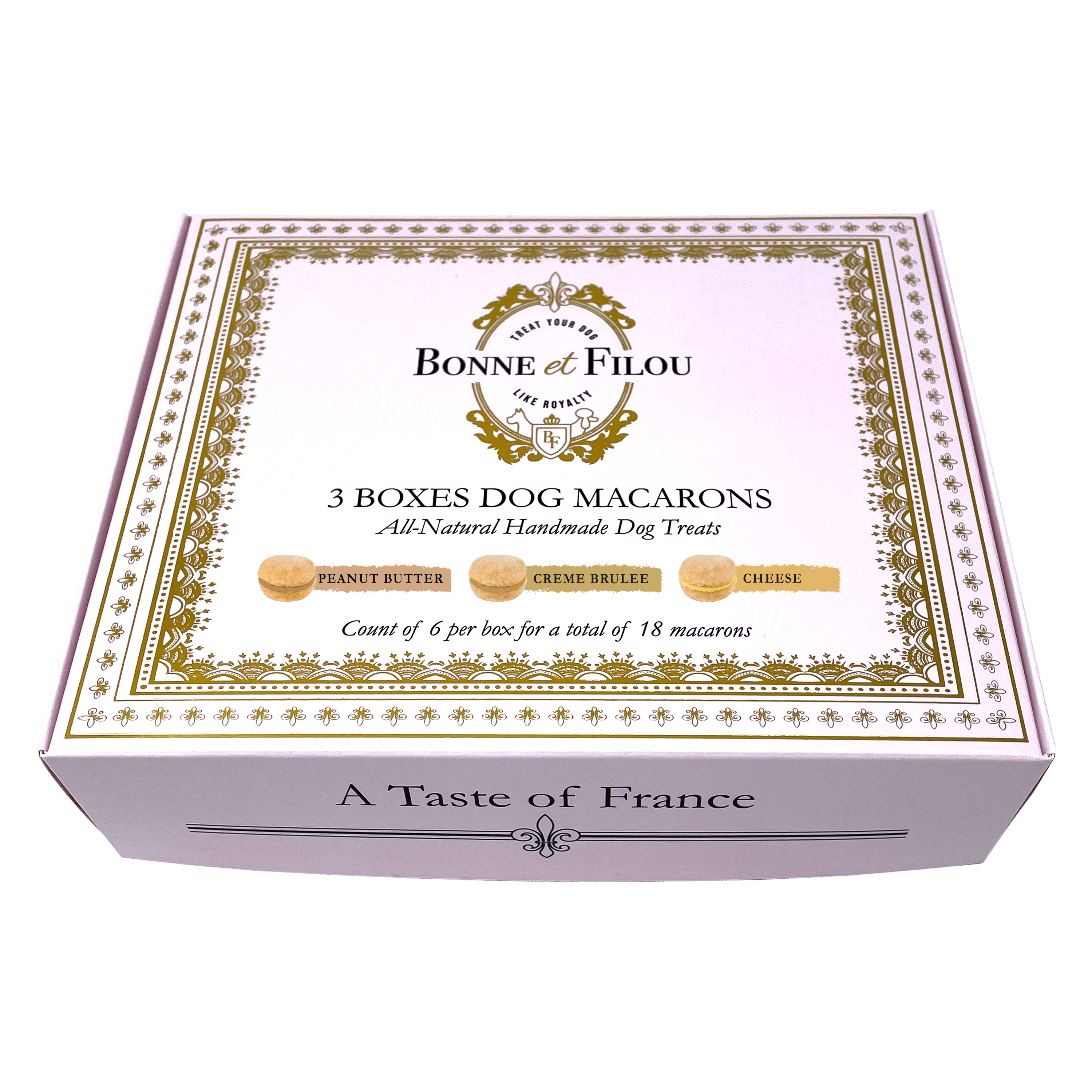 Our exclusive gift set includes 3 boxes of 6 macarons (total of 18 delectable dog macarons); and is without a doubt the best gift for any dog lovers (or your own pup)!- Handmade in small batches in the USA- Gift box includes 3 boxes of 6 macarons (total of 18 macarons)- Made with premium human-grade; all-natural ingredients- 100% natural; corn-free; wheat-free; non-GMO ingredients- No artificial coloring or any preservatives- Hard treat designed for a long-lasting chew- Shelf life of 18+ months | No need for refrigeration